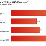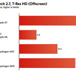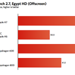 Whatever the underlying architecture, the takeaway is that the GPU appears more than capable of doubling the performance of the A6's GPU, especially in GFXBench's demanding T-Rex HD benchmark. Note that GFXBench hasn't yet been recompiled to run in 64-bit mode, so it's possible that if any of these benchmarks are in any way CPU-limited, we may see further gains when the benchmark is updated.