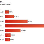 In each case, the 64-bit version of Safari on the A7 outruns the 32-bit version on the A6 by around 100 percent, usually by a little more. These scores also outdo Android SoCs like the mighty Snapdragon 800 with ease, though these browser scores should be taken with a small grain of salt in this case. Apple's ability to fine-tune its software for its specific hardware has almost always allowed its phones to post the JavaScript scores of more powerful Android phones, and heavily threaded tasks in real apps may still favor more cores to faster ones.